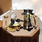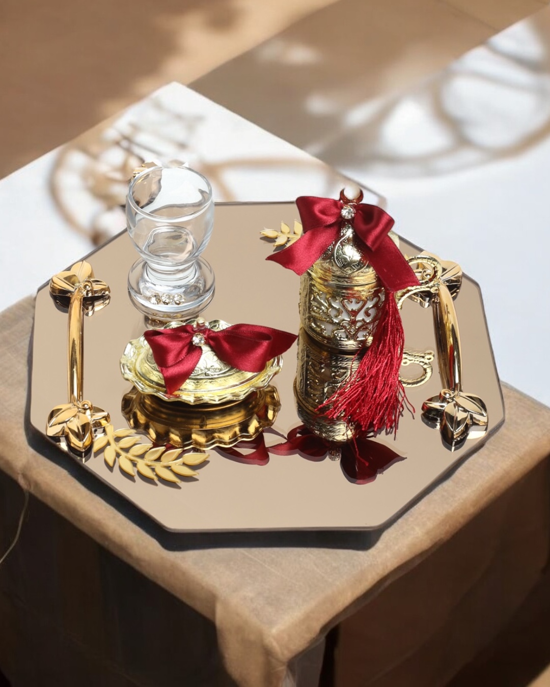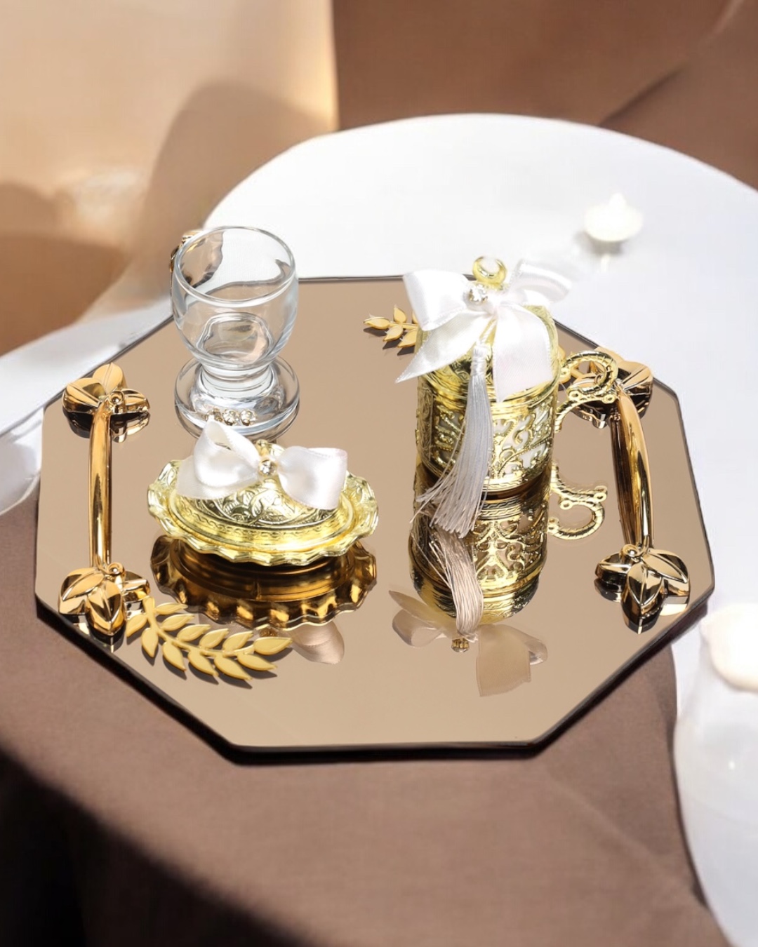 Her özel günün unutulmaz detayları vardır. Sevdiklerinizle geçirdiğiniz değerli anların en anlamlı simgesi olan altın sekizgen damat kahve tepsisi, hem göz alıcı hem de işlevseldir. İnce detaylarla süslenmiş bu set, size sade ama etkileyici bir şıklık sunar.
