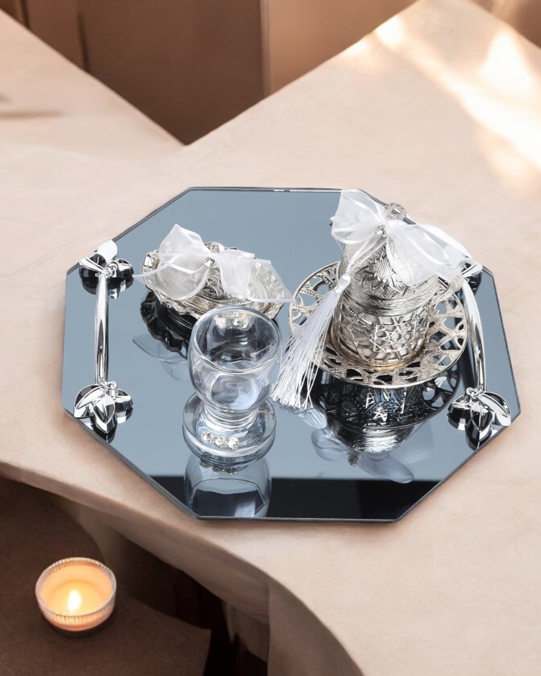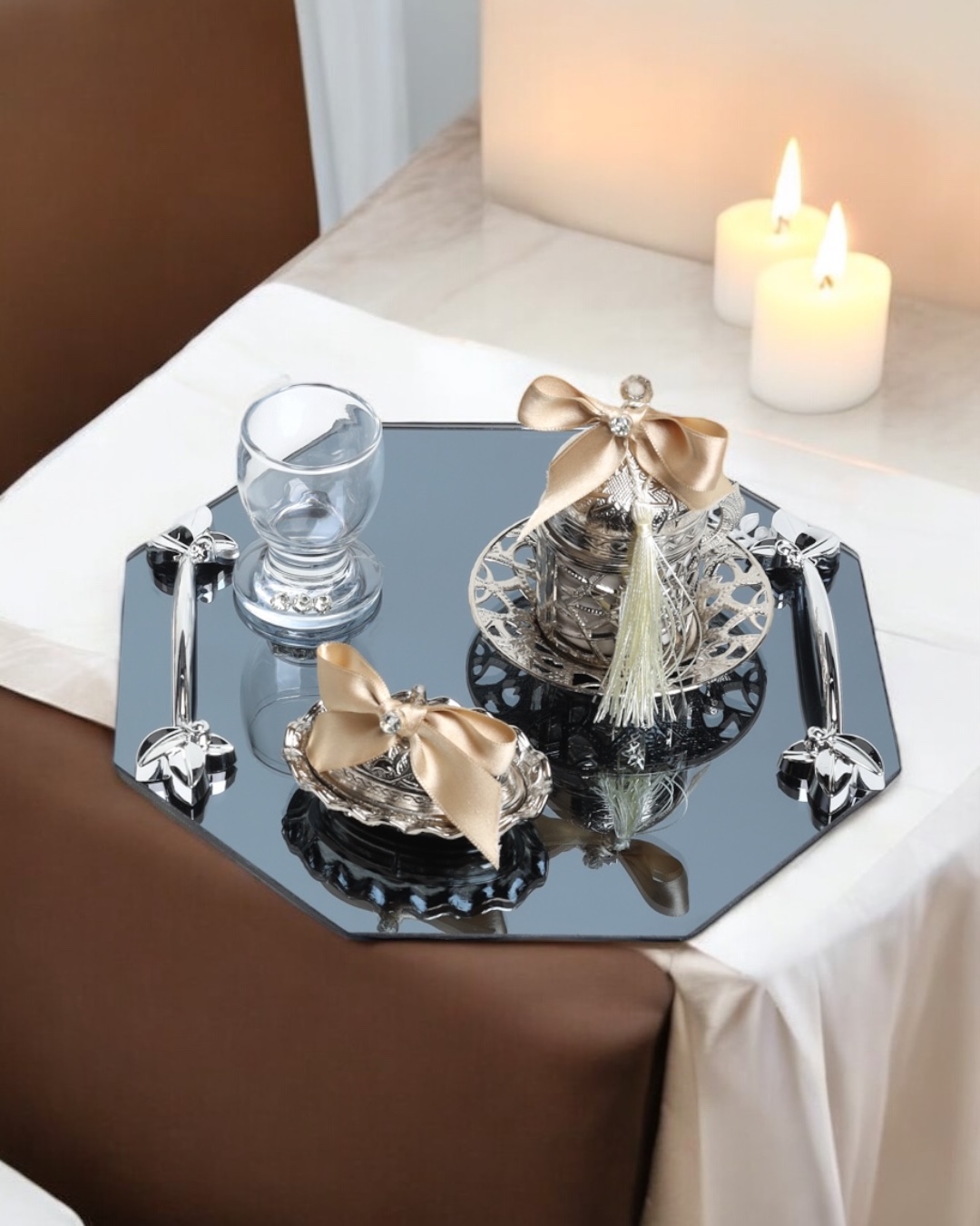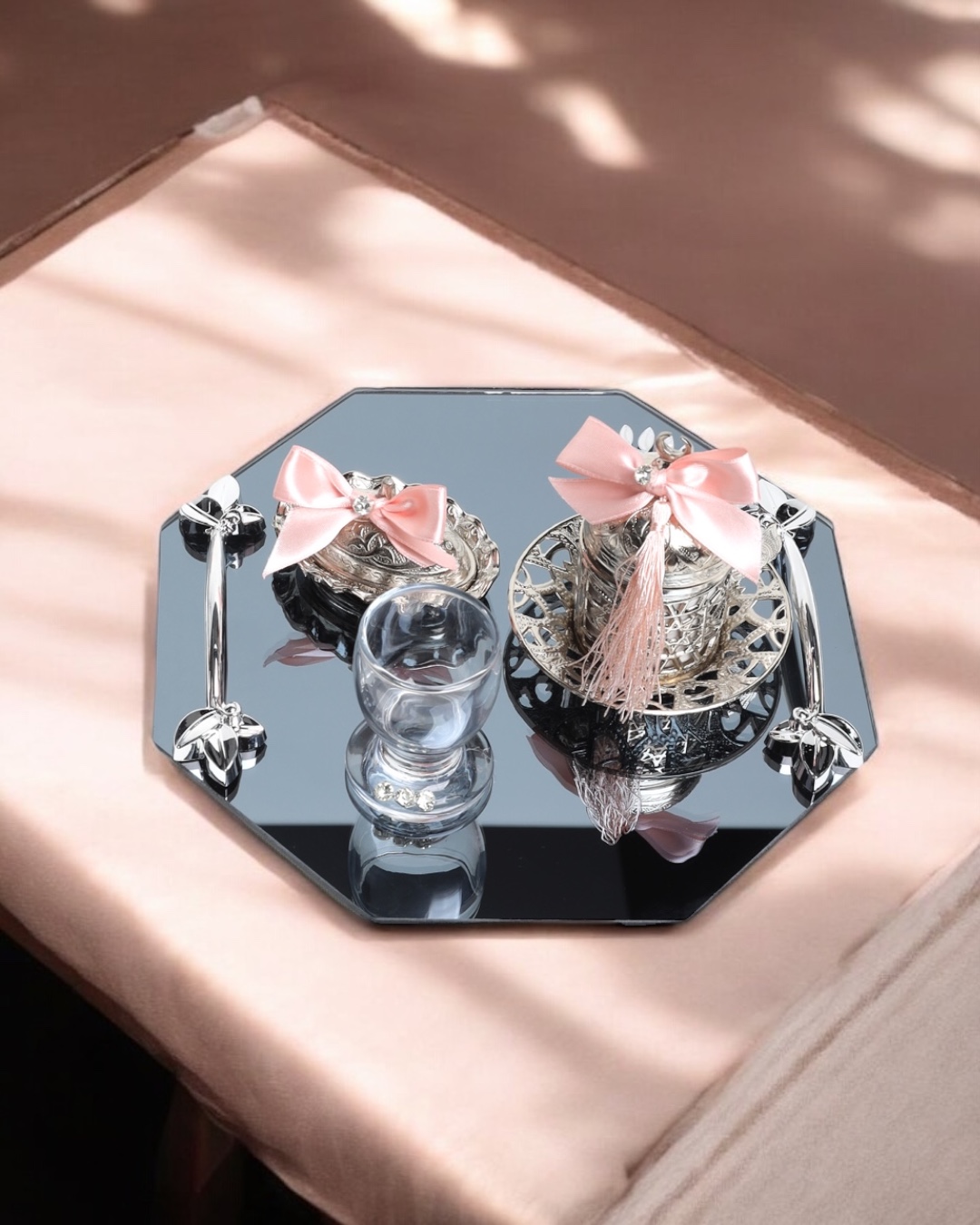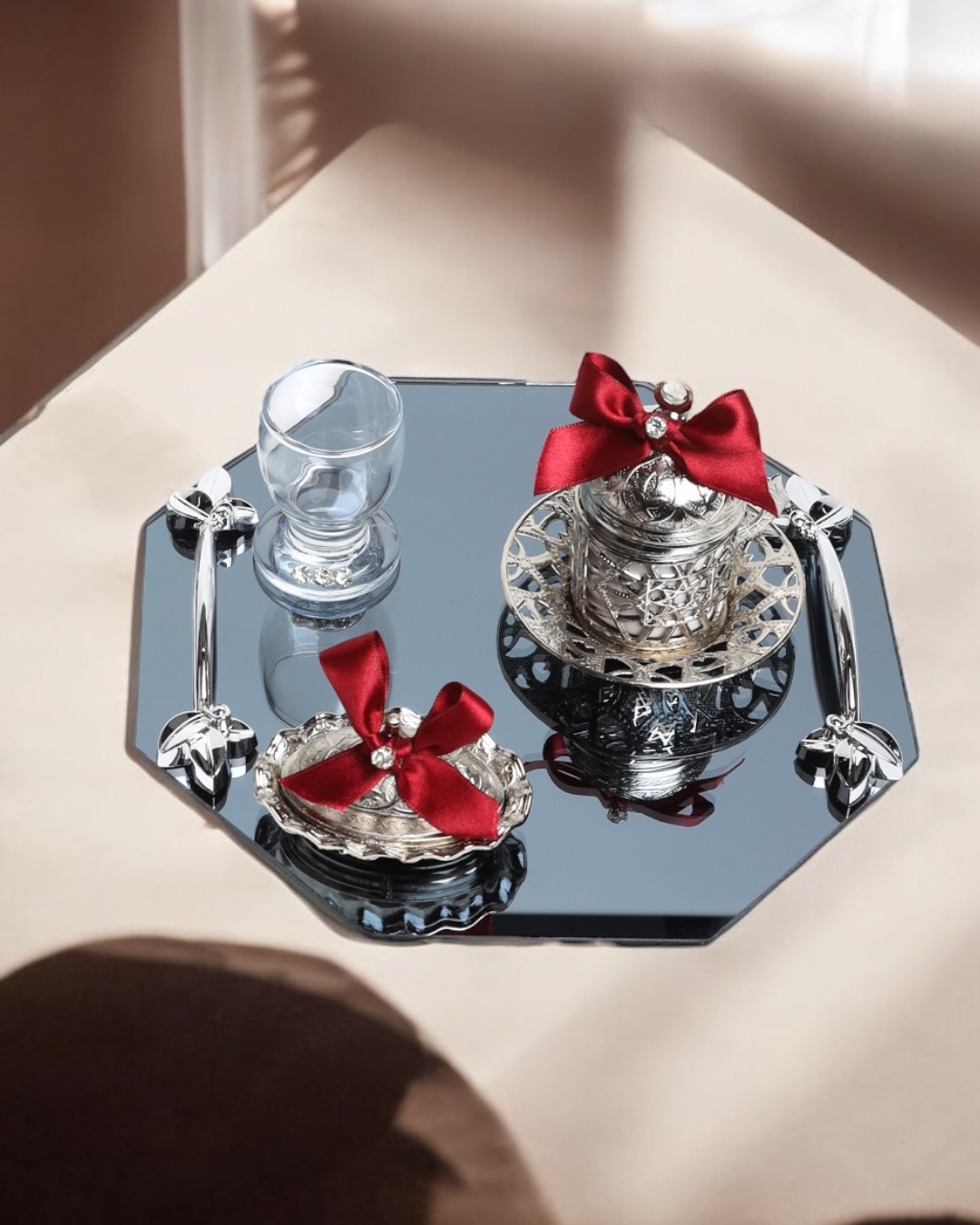 Zarif Tasarım: Sekizgen formu, geleneksel Türk kültüründen esinlenen modern bir dokunuşla harmanlanmıştır. Bu detay, kahve tepsinizi hem anlamlı hem de göz alıcı bir hale getirir.