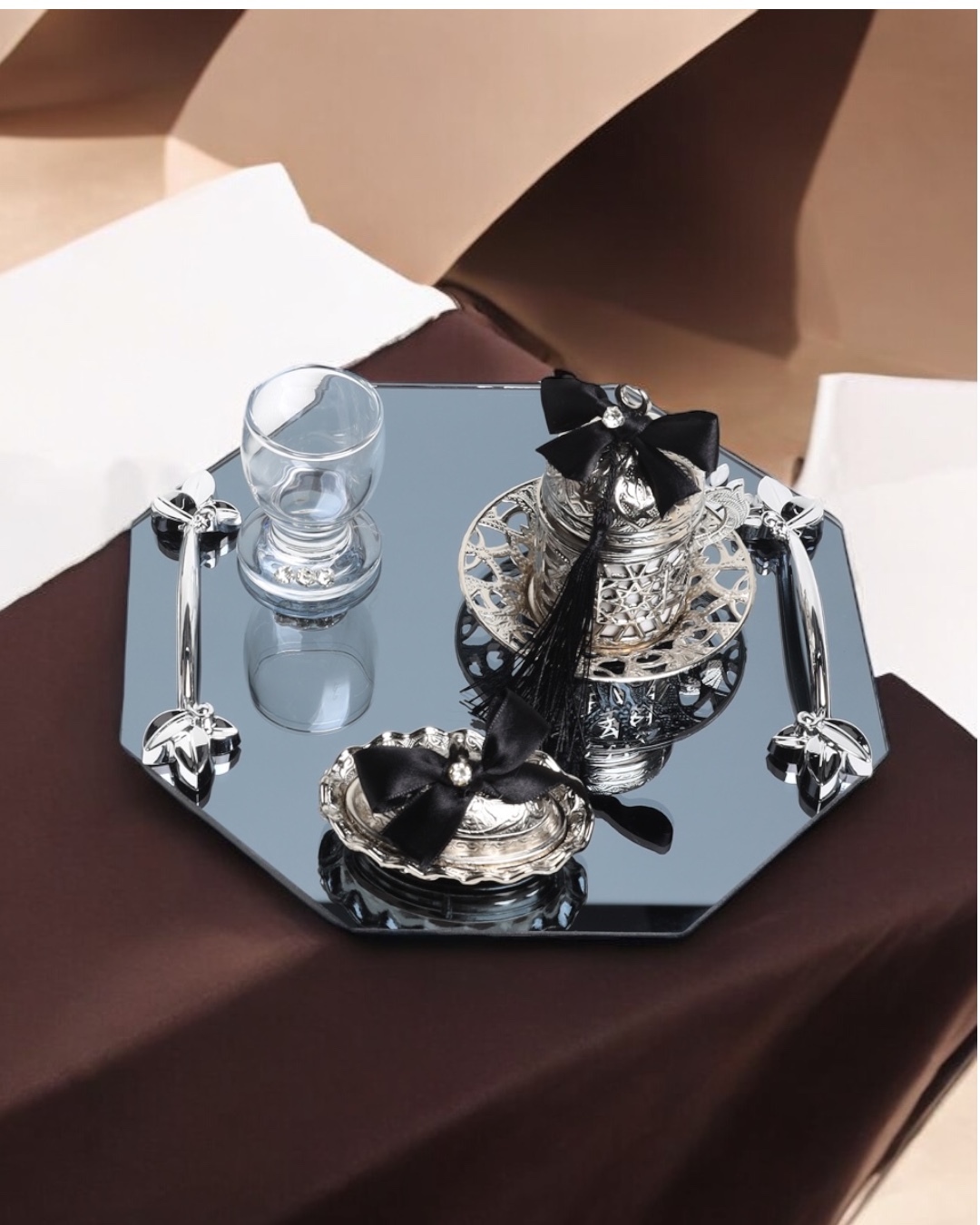 Özel anlarınızda sizi yansıtan detayların seçimi, hafızalarda iz bırakacak bir ambiyans yaratır. Bu damat kahve tepsisi seti, söz ve nişan organizasyonlarınızda anlamlı bir başlangıç yapmanızı sağlar. Affinity’nin ilham veren estetiği, zarif bir şıklıkla buluşarak unutulmaz anlar yaratmanıza yardımcı olur.