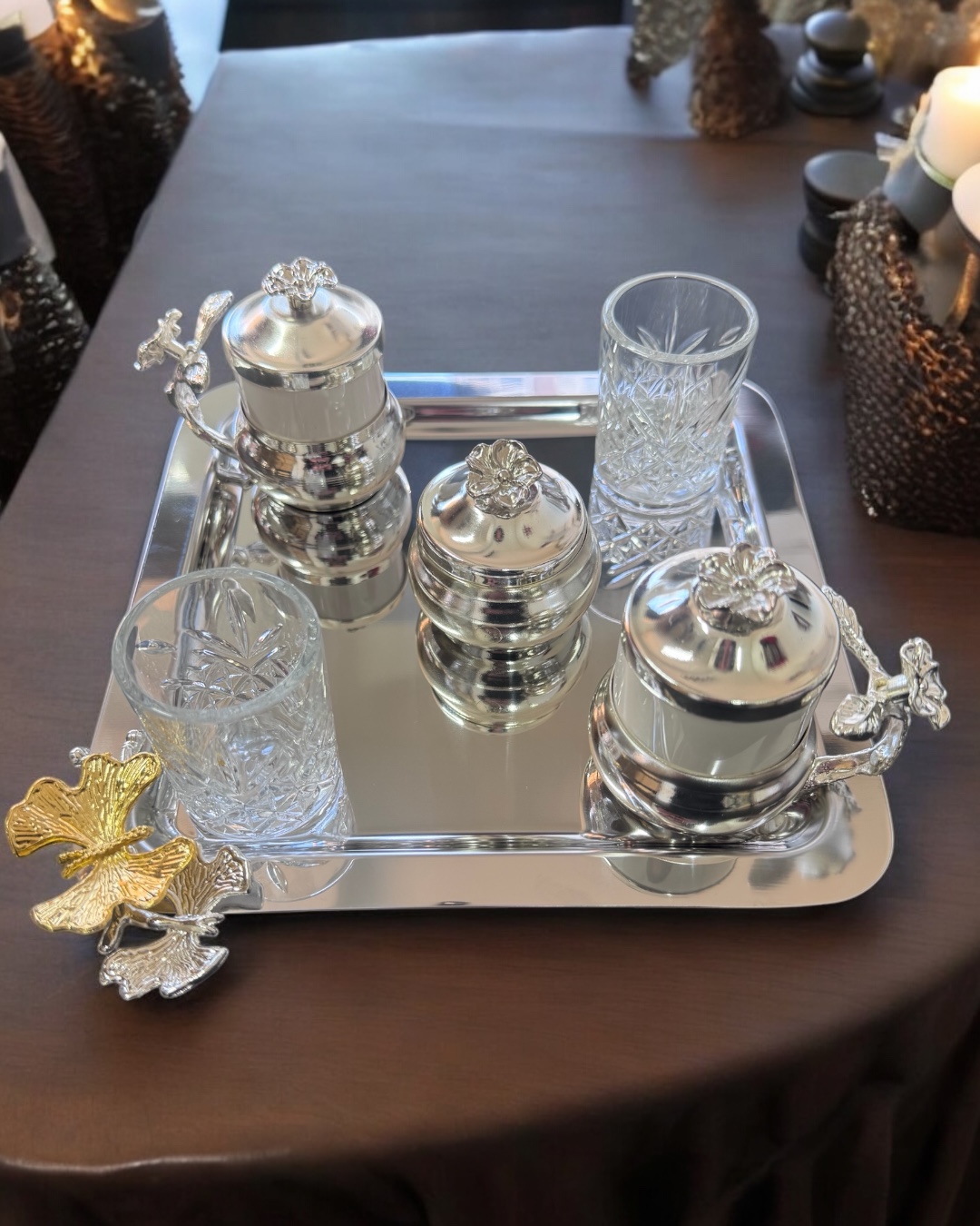 Tepsi üzerine yerleştirilen lokumluk ve kahve fincanları, adeta romantizmi ve şıklığı yeniden tanımlar. Minimalist detaylarla süslenmiş bu fincanlar, geleneksel bir dokunuşla modern tasarımı bir araya getirir. Yanındaki bardaklar ise su servisi için şık bir tamamlayıcıdır.