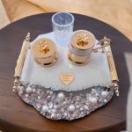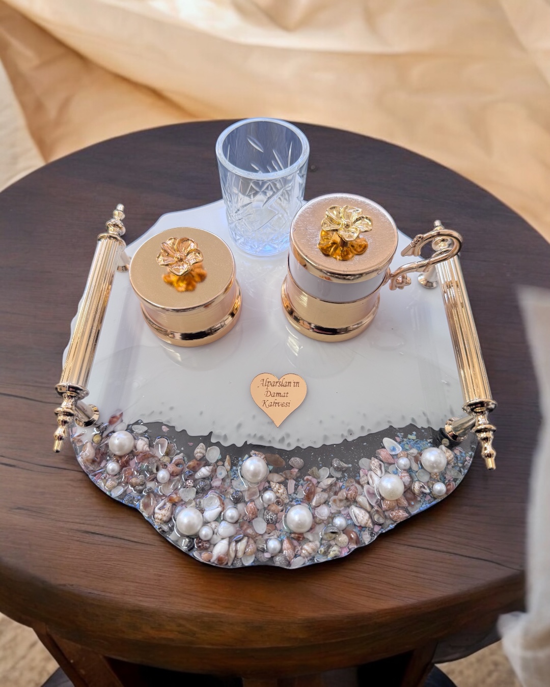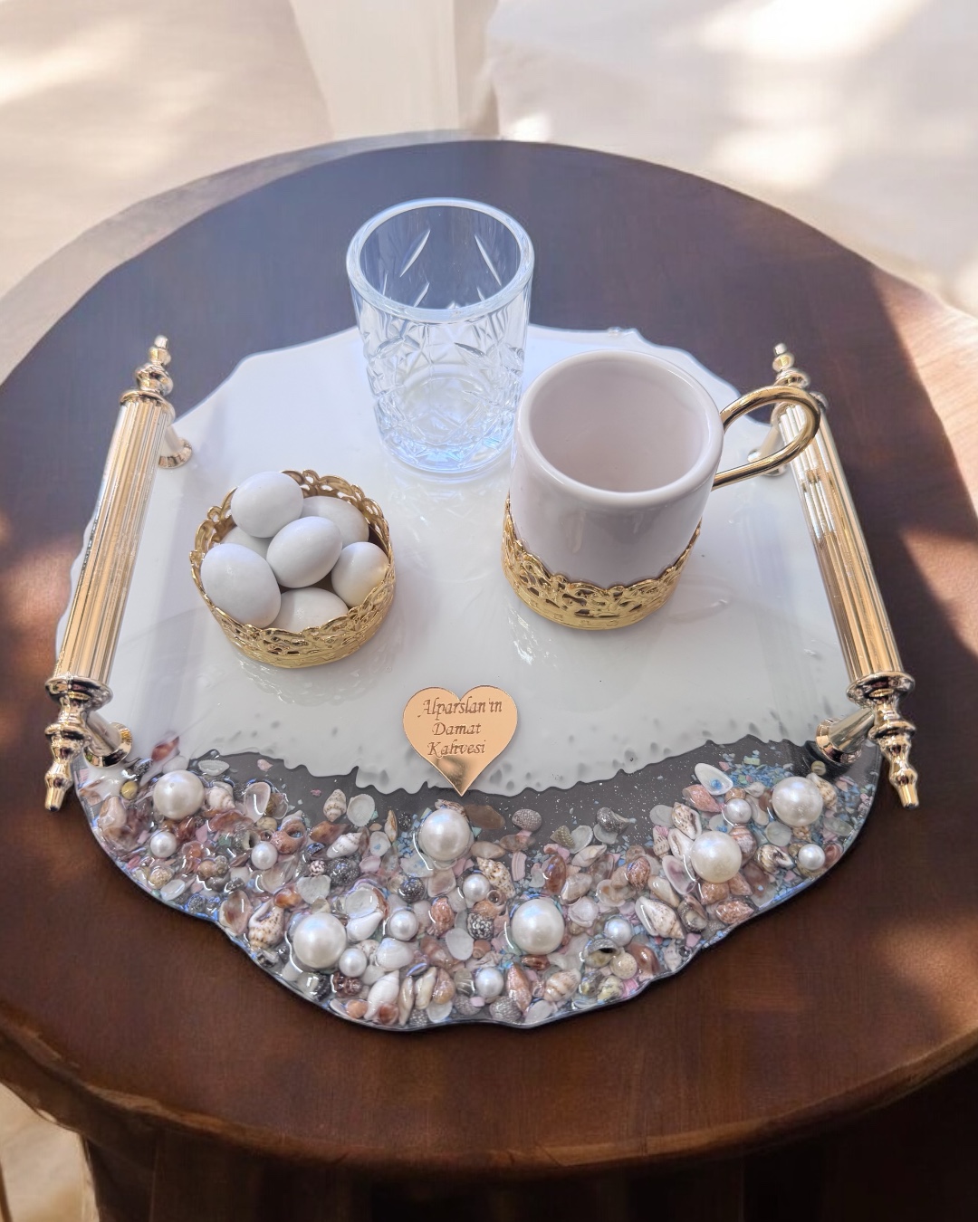 Hayatta bazı anlar vardır ki, onların eşsizliğini hissetmek istersiniz. Bu altın epoksi incili söz nişan damat kahve fincan tepsisi, o anlar için tasarlanmış özel bir parçadır. Dreamy tasarım anlayışıyla hazırlanan bu ürün, unutulmaz anlarınızda size eşlik etmek için tasarlandı. Söz veya nişan gibi özel günler, yalnızca mutluluğun değil, aynı zamanda zarif detayların bir araya geldiği anlar olmalıdır. İşte bu tepsi, hem o anların zarafetini hem de unutulmazlığını vurgulamak için ideal bir seçim.