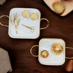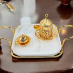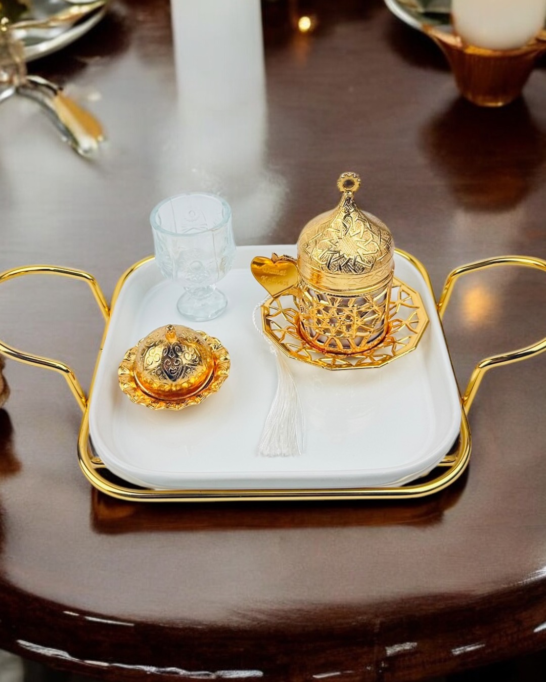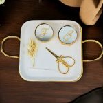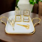 Gold Metal Detaylı Porselen Nişan Tepsisi: Zarif porselen malzeme ile tasarlanmış, nişan töreninizi özel kılacak şık tepsi. Estetik tasarımı ve zarif detaylarıyla, aşkınızın başlangıcını taçlandırır. Yüzüklük: Evlilik yolculuğunun en önemli simgelerinden biri olan yüzüklerinizi zarifçe taşıyan şık ve estetik yüzüklük. Söz Makası: Geleneksel söz kesme ritüelini kusursuz bir şekilde yerine getirebilmek için tasarlanmış şık, zarif makas. Tepsi Çiçeği: Tepsinin estetik görünümünü tamamlayan, doğal veya yapay çiçekle süslenmiş detaylar. Damat Kahve Fincanı: Damat için özel olarak tasarlanmış, geleneksel Türk kahvesi içimine uygun zarif fincan. Kahve Yanı Su Bardağı: Nişan ve söz merasimlerinde kahve ile birlikte sunulacak, zarif ve uyumlu su bardağı. Lokumluk: Tatlı ikramları için kullanılan, şıklığı ve zarafeti simgeleyen zarif lokumluk.Ürün İçeriği: