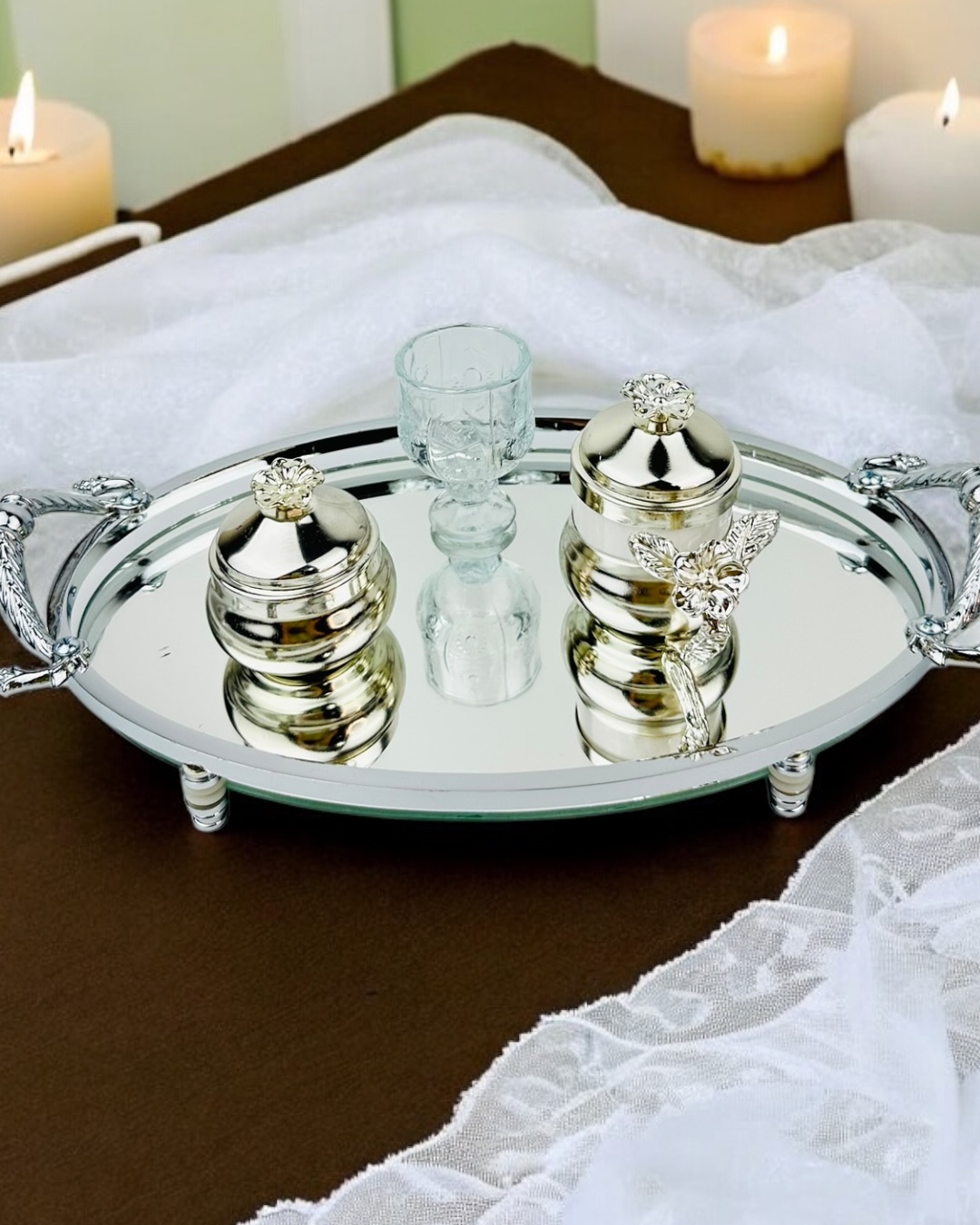Dekoratif Süslemeler: Gümüş tepsi çiçeği ve diğer dokunuşlarla şıklığı tamamlar.