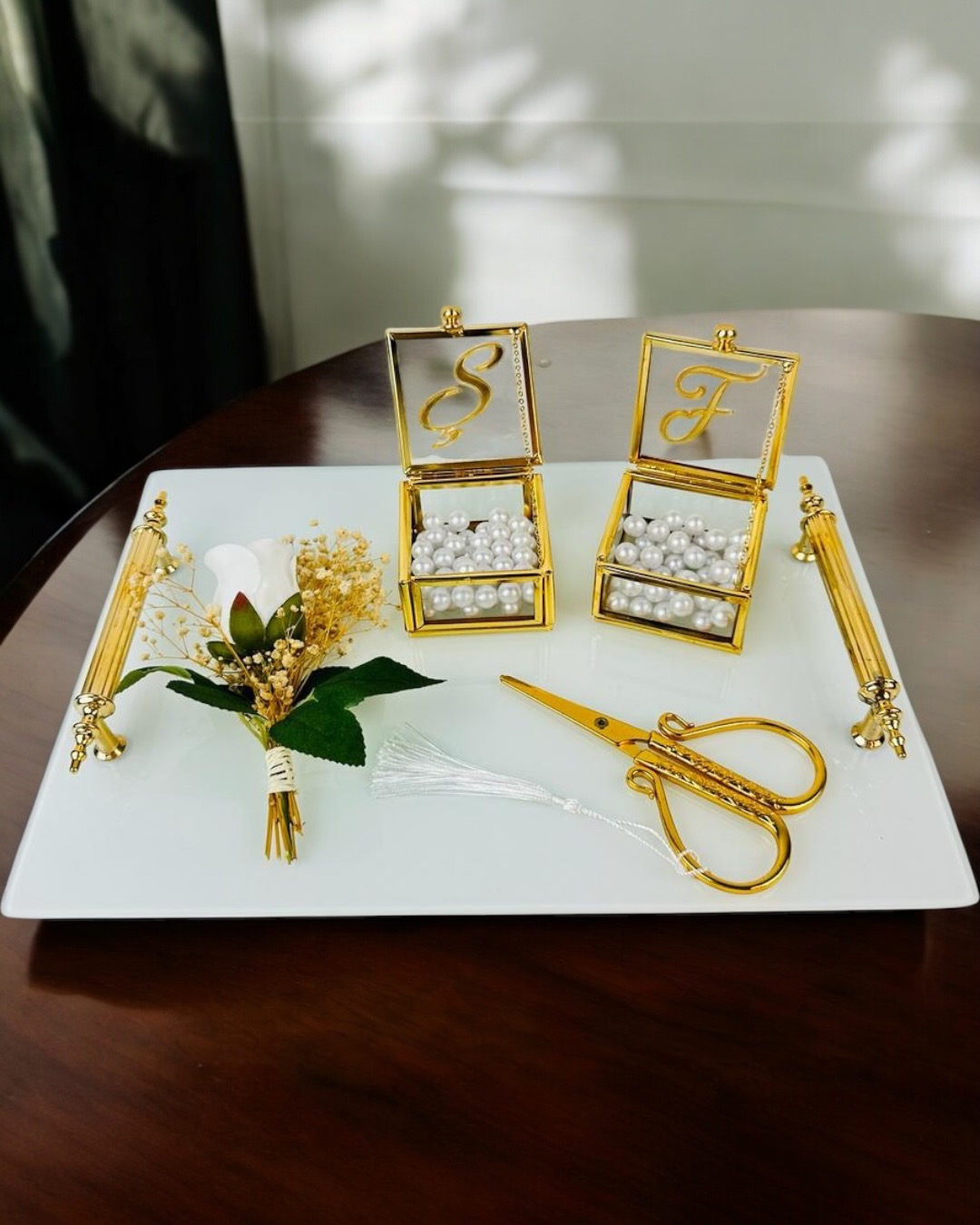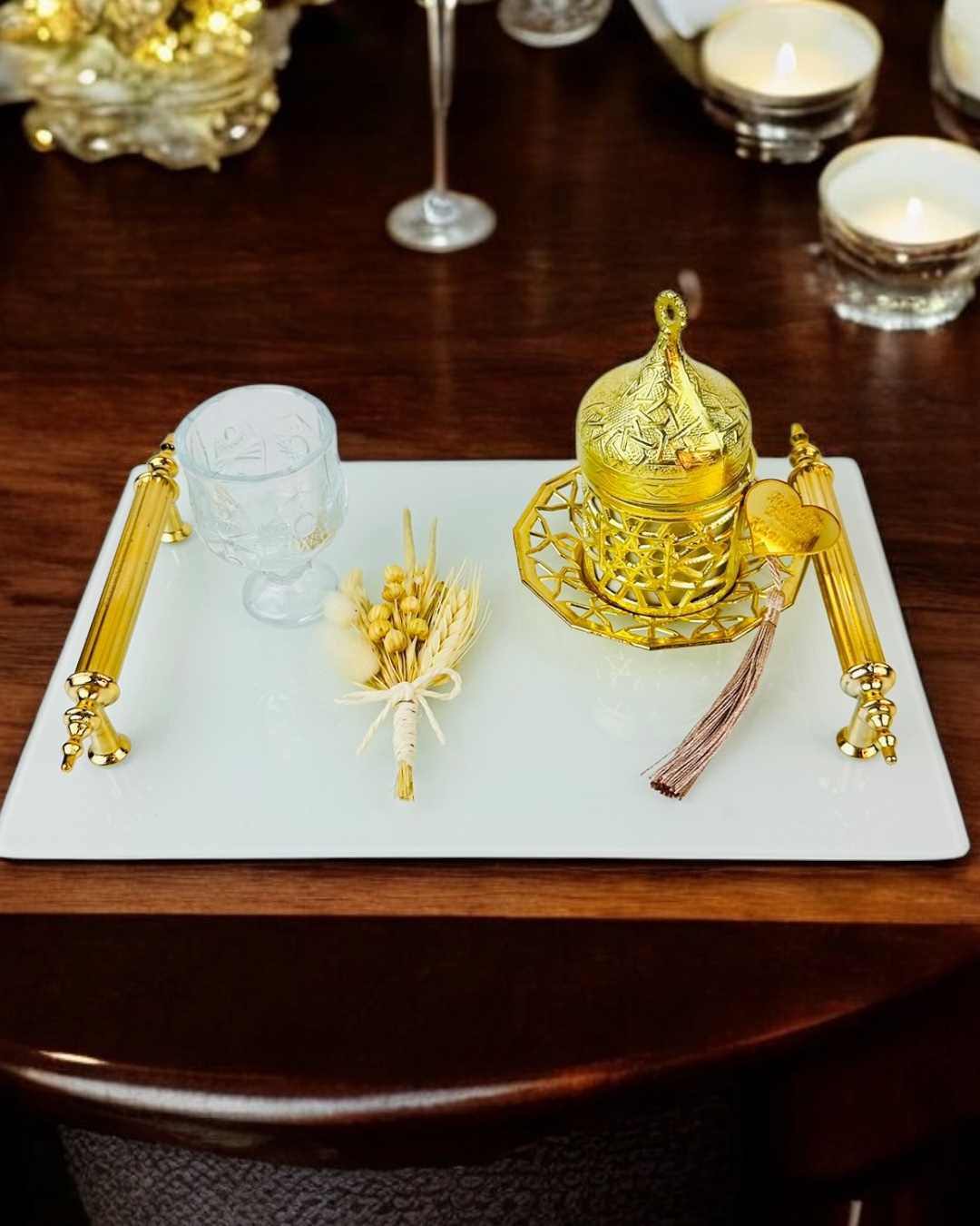 Bu eşsiz tepsi, sadece bir nişan tepsisi değil, birbirinize verdiğiniz sözün bir hatırlatıcısıdır. Beyaz cam ve zarif tasarım, her anınızı özel kılmak için mükemmel bir seçimdir.