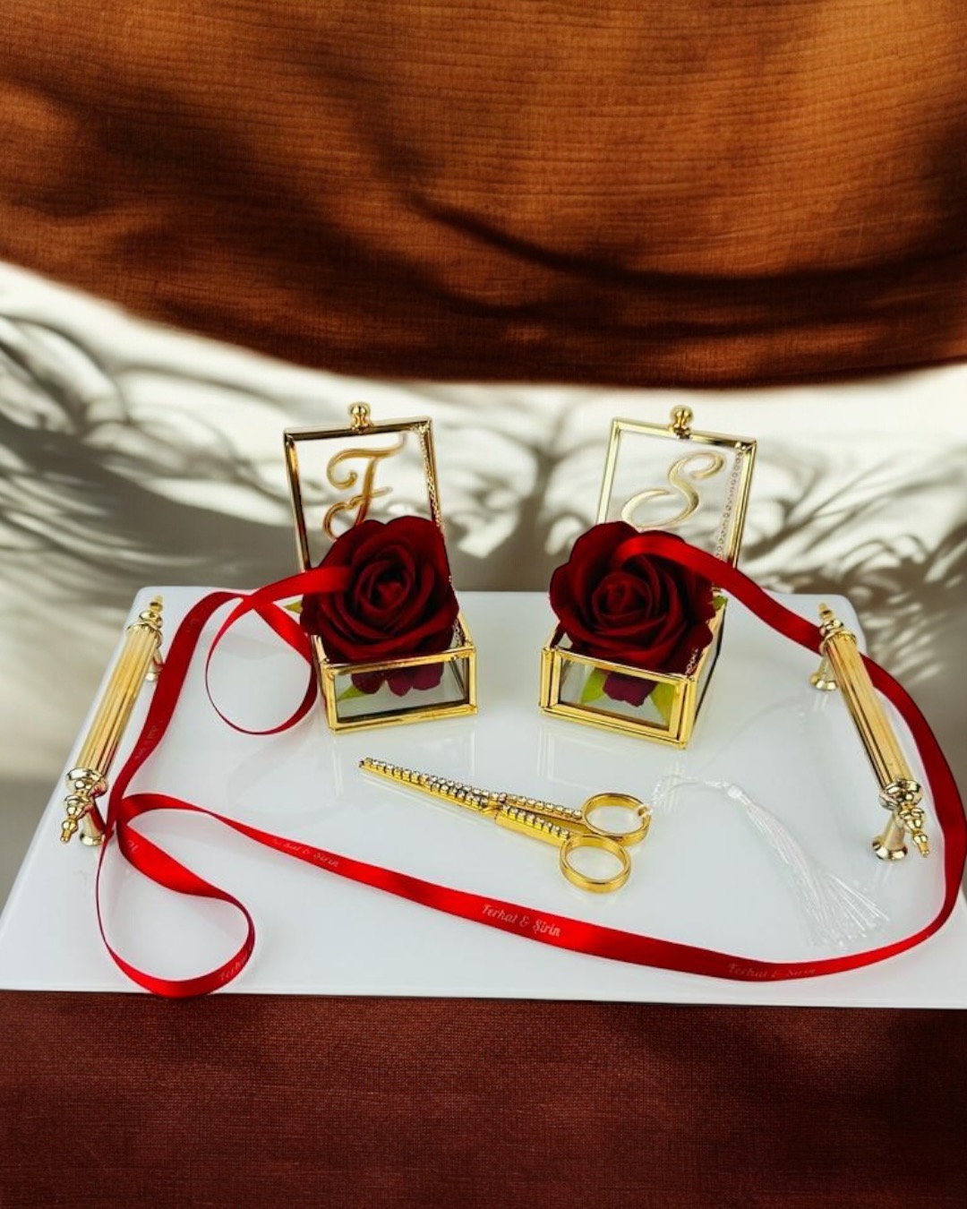 Beyaz Cam Söz Nişan Tepsisi (33*23-26*17): Zarafeti ve asil duruşuyla, beyaz cam malzeme ile tasarlanmış bu tepsi, hayatınızın en özel anlarını şıklıkla yansıtır. Söz ve nişan töreninizin unutulmaz başlangıcını simgeler. Yüzüklük: Bir ömrü birlikte geçirme sözü verdiğiniz yüzüklerinizi, bu zarif yüzüklükle şık bir şekilde sunarsınız. Söz Makası: Geleneksel söz kesme anını, bu zarif ve şık makas ile daha da anlamlı kılın. Tepsi Çiçeği: Nişan tepsisini estetik açıdan tamamlayan doğal veya yapay çiçekler, hayatınıza taptaze bir dokunuş katar. Damat Kahve Fincanı: Türk kahvesinin geleneksel lezzetini, damat için özel olarak tasarlanmış bu zarif fincan ile taçlandırın. Kahve Yanı Su Bardağı: Nişan törenlerinde ikram edilen su bardağı, kahveyle uyumlu şekilde tasarlanarak zarif bir bütünlük oluşturur. Lokumluk: Tatlı ikramları için kullanılan şık lokumluk, yeni bir hayatın tatlı başlangıcını simgeler.Ürün İçeriği: